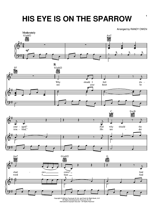 Digital Sheet Music for His Eye Is On The Sparrow by Randy Owen, Alabama scored for Piano/Vocal/Chords; id:396047