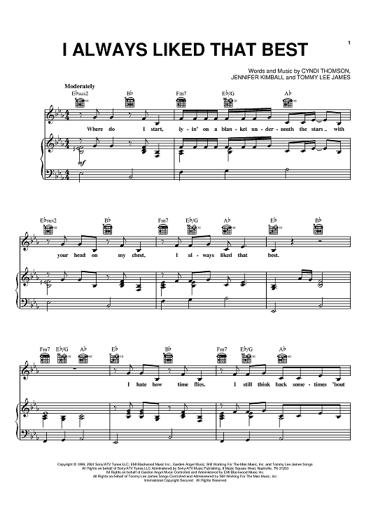 Digital Sheet Music for I Always Liked That Best by Jennifer Kimball, Tommy Lee James, Cyndi Thomson scored for Piano/Vocal/Chords; id:368894