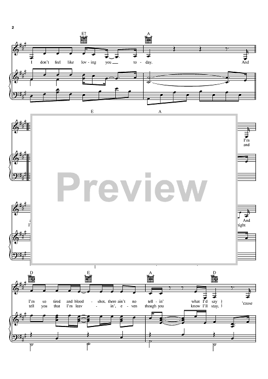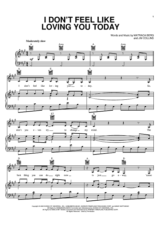 Digital Sheet Music for I Don't Feel Like Loving You Today by Jim Collins, Matraca Berg, Gretchen Wilson scored for Piano/Vocal/Chords; id:388165