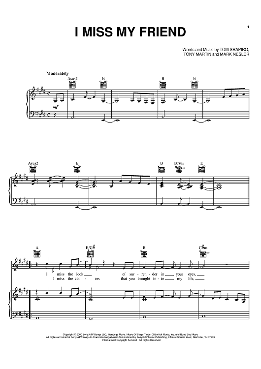 Digital Sheet Music for I Miss My Friend by Tony Martin, Mark Nesler, Tom Shapiro, Darryl Worley scored for Piano/Vocal/Chords; id:368911