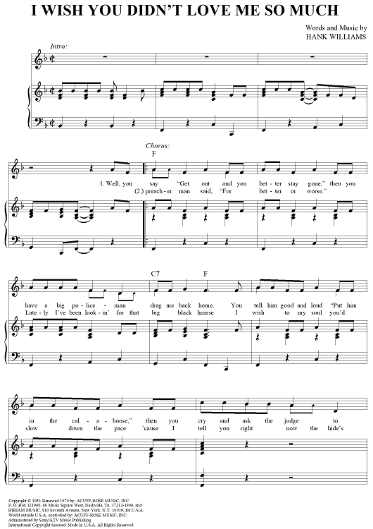 "I Wish You Didn't Love Me So Much" Sheet Music by Hank Williams