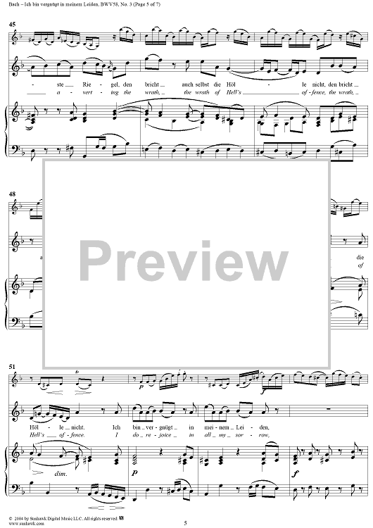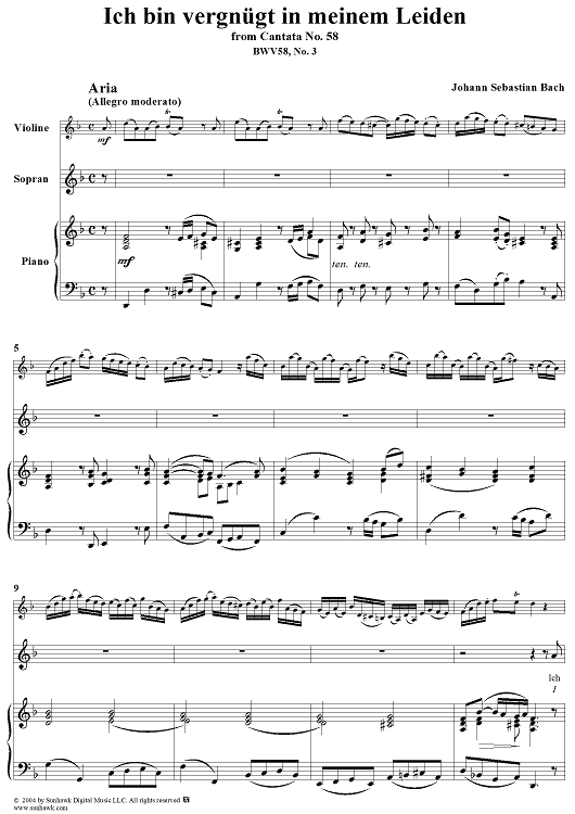 Digital Sheet Music for "Ich bin vergnügt in meinem Leiden", Aria, No. 3 from Cantata No. 58: "Ach Gott, wie manches Herzeleid" - Piano Score by Johann Sebastian Bach scored for Soprano, Violin and Piano or Organ; id:304653