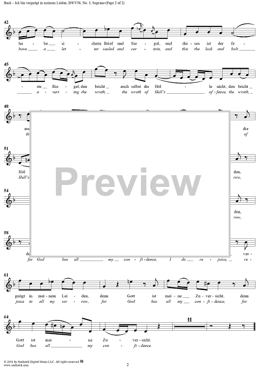 Digital Sheet Music for "Ich bin vergnügt in meinem Leiden", Aria, No. 3 from Cantata No. 58: "Ach Gott, wie manches Herzeleid" - Soprano by Johann Sebastian Bach scored for Soprano, Violin and Piano or Organ; id:304655