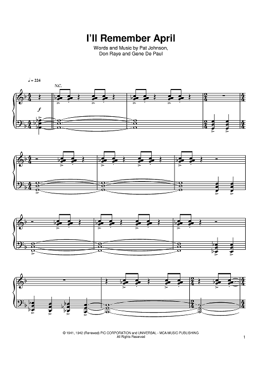 Digital Sheet Music for I'll Remember April by Erroll Garner, Don Raye, Gene De Paul, Dave Brubeck, Pat Johnson, Bud Powell scored for Piano; id:374044