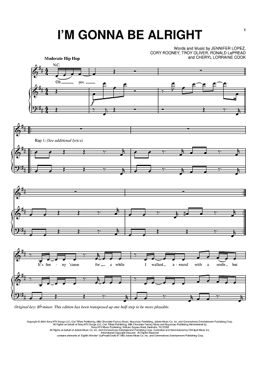 Digital Sheet Music for I'm Gonna Be Alright by Jennifer Lopez, Troy Oliver, Cory Rooney, Nas, Cheryl Lorraine Cook, Ronald LaPread scored for Piano/Vocal/Chords; id:368909