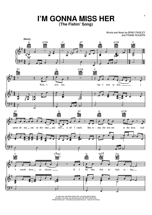 Digital Sheet Music for I'm Gonna Miss Her (The Fishin' Song) by Frank Rogers, Brad Paisley scored for Piano/Vocal/Chords; id:367824