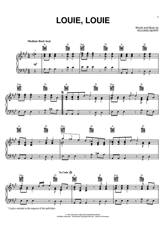 Digital Sheet Music for Louie, Louie by Richard Berry, The Kingsmen scored for Piano; id:370149