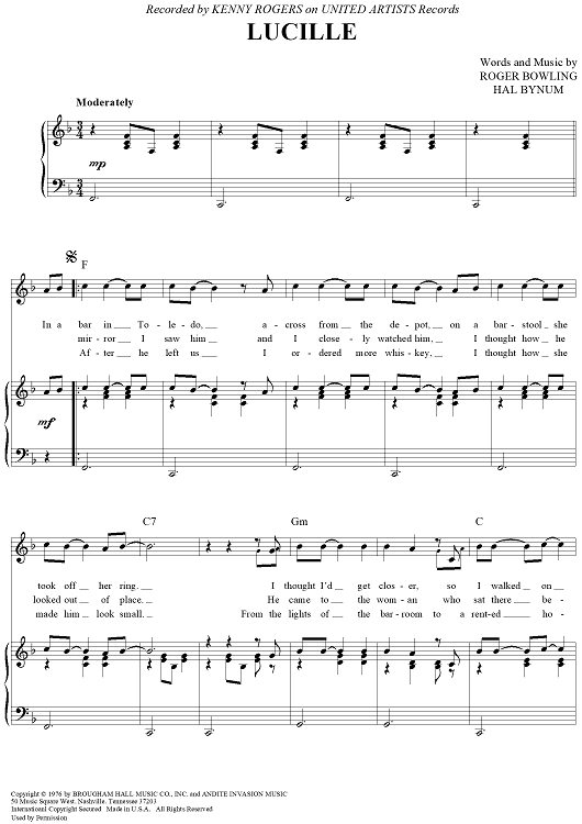 Digital Sheet Music for Lucille by Kenny Rogers, Hal Bynum, Roger Bowling scored for Piano/Vocal/Chords; id:362858