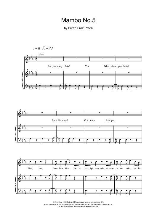 Digital Sheet Music for Mambo No.5 by Perez Prado scored for Piano/Vocal/Chords; id:379612