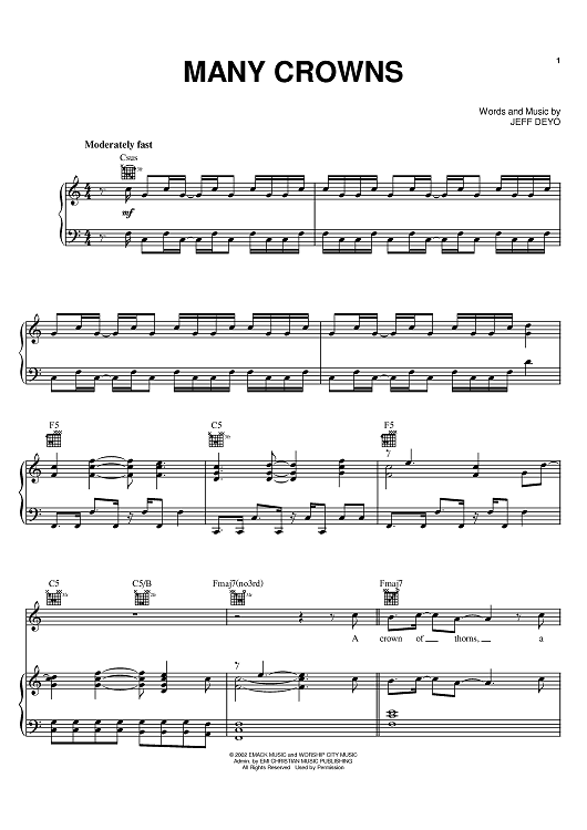 Digital Sheet Music for Many Crowns by Jeff Deyo scored for Piano/Vocal/Chords; id:373771
