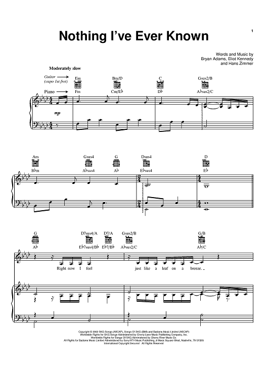 Digital Sheet Music for Nothing I've Ever Known by Bryan Adams, Hans Zimmer, Eliot Kennedy scored for Piano/Vocal/Chords; id:370397