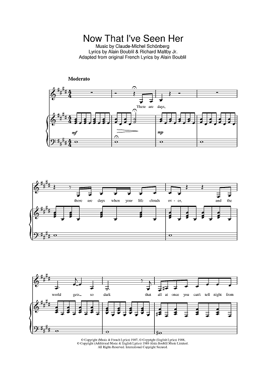 Digital Sheet Music for Now That I've Seen Her by Claude-Michel Schonberg, Alain Boublil, Richard Maltby Jr. scored for Piano/Vocal/Chords; id:386826