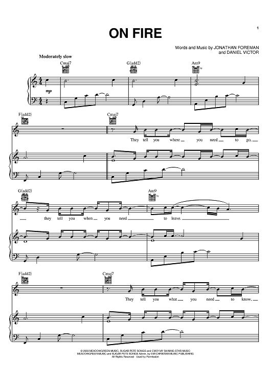 Digital Sheet Music for On Fire by Jonathan Mark Foreman, Switchfoot, Daniel Heavenword scored for Piano/Vocal/Chords; id:372027