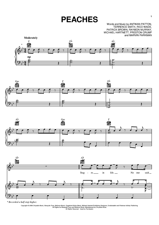 Digital Sheet Music for Peaches by Big Boi, OutKast, Patrick Brown, Preston Crump, Mike Hartnett, Raymon Murray, Marvin Parkman, Terrence Smith, Rico Wade scored for Piano/Vocal/Chords; id:396067