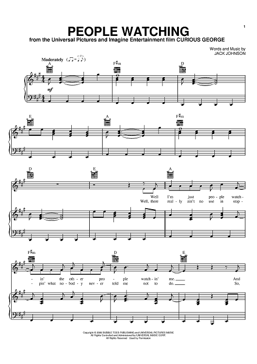 Digital Sheet Music for People Watching by Jack Johnson scored for Piano/Vocal/Chords; id:393269