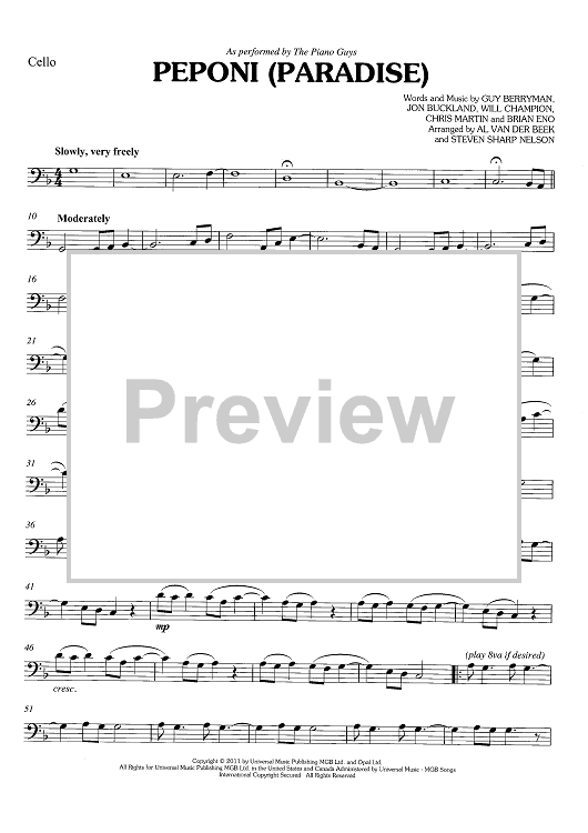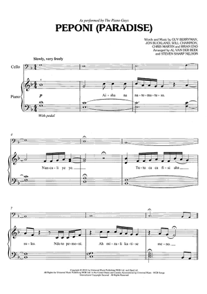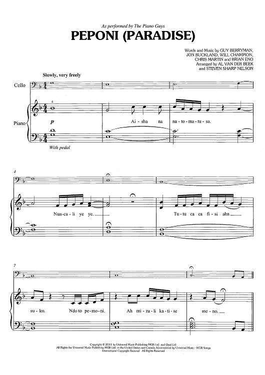 Digital Sheet Music for Peponi (Paradise) by Chris Martin, Brian Eno, Jonny Buckland, Guy Berryman, Al Van Der Beek, Steven Sharp Nelson, The Piano Guys scored for Cello and Piano; id:465562