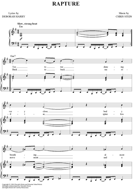 Digital Sheet Music for Rapture by Blondie, Deborah Harry, Chris Stein scored for Piano/Vocal/Chords; id:380397