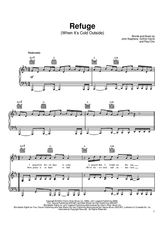 Digital Sheet Music for Refuge (When It's Cold Outside) by John Legend, Paul Cho, DeVon Harris scored for Piano/Vocal/Chords; id:384089