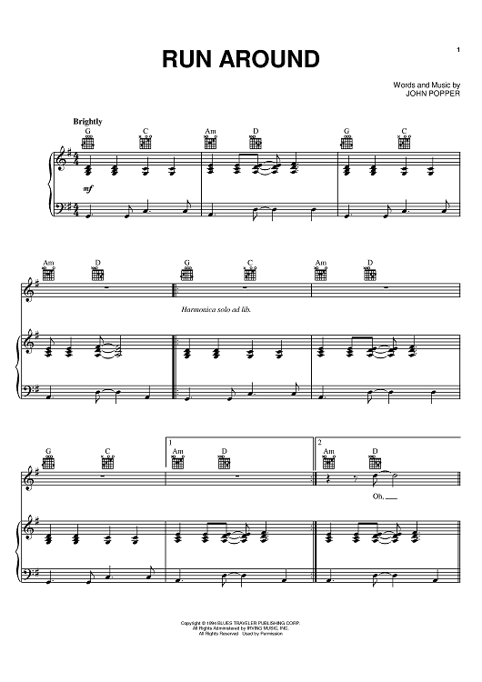 Digital Sheet Music for Run Around by Blues Traveler, John Popper scored for Piano/Vocal/Chords; id:369039
