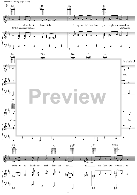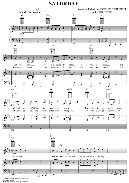 "Saturday" Sheet Music by The Carpenters
