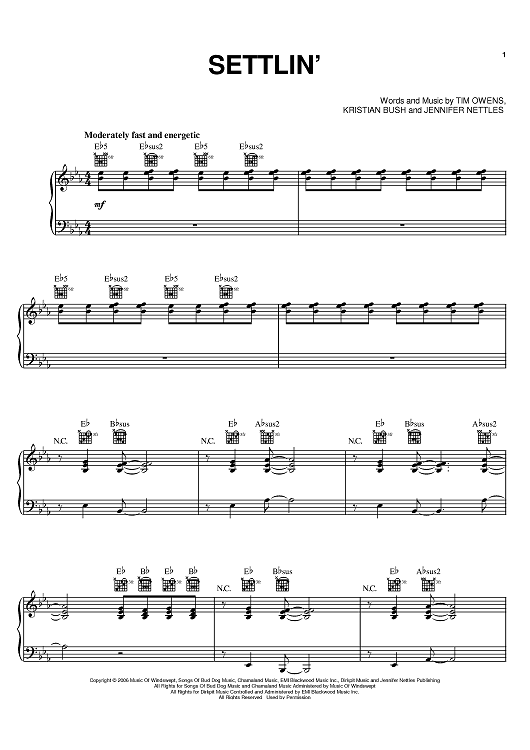 Digital Sheet Music for Settlin' by Kristian Bush, Jennifer Nettles, Tim Owens, Sugarland scored for Piano/Vocal/Chords; id:395406