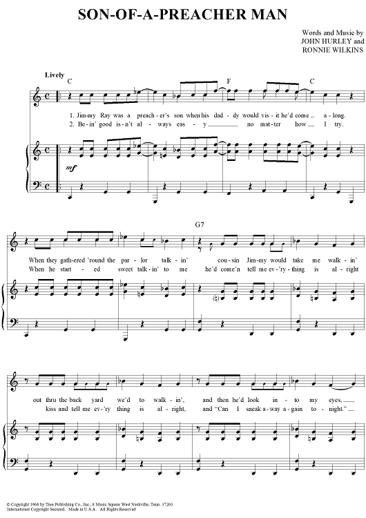 Digital Sheet Music for Son Of A Preacher Man by Tanya Tucker, Dusty Springfield, John Hurley, Ronnie Wilkins scored for Piano/Vocal/Chords; id:362910