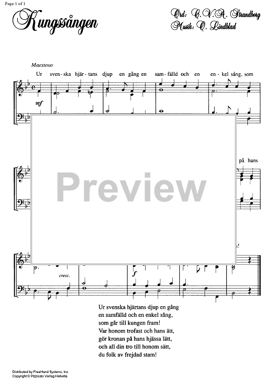Digital Sheet Music for Sweden - Kungssangen by Otto Jonas Lindblad scored for Piano/Vocal; id:329007