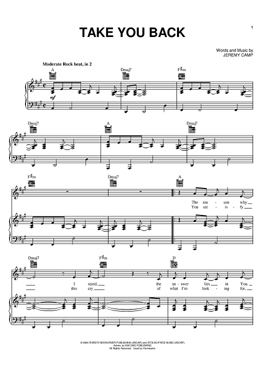 Digital Sheet Music for Take You Back by Jeremy Camp scored for Piano/Vocal/Chords; id:381860