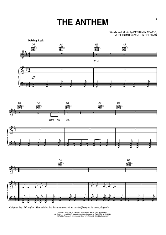 Digital Sheet Music for The Anthem by Benji Madden, Joel Madden, Good Charlotte, John Feldman scored for Piano/Vocal/Chords; id:371310