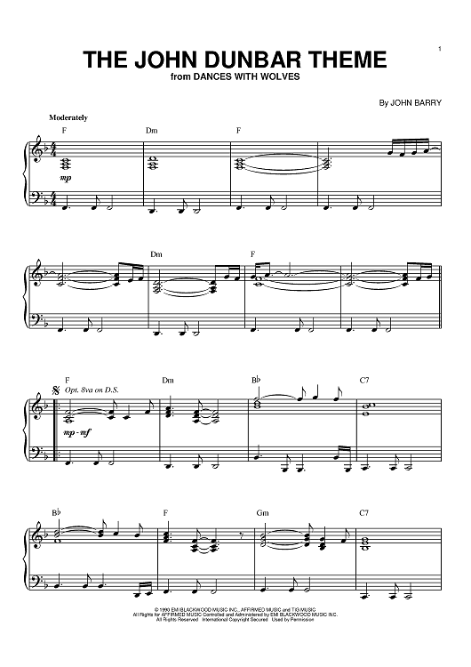 Digital Sheet Music for The John Dunbar Theme by John Barry scored for Piano; id:380646