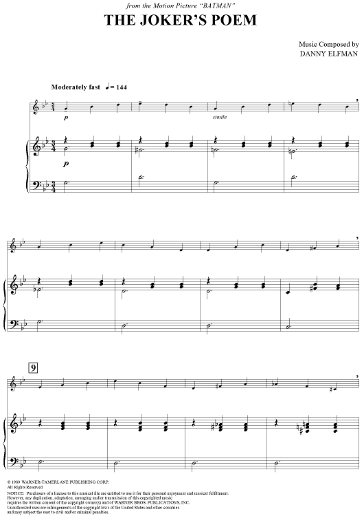 Digital Sheet Music for The Joker's Poem - from the movie "Batman" by Danny Elfman scored for Piano Accompaniment; id:270301