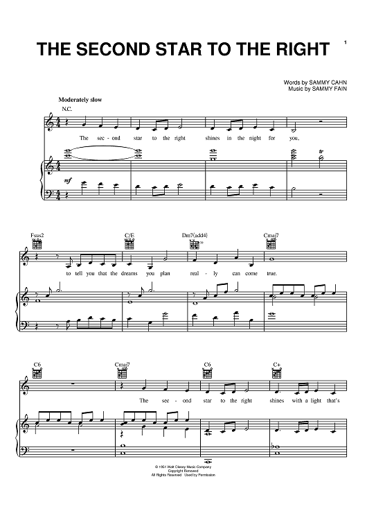 Digital Sheet Music for The Second Star To The Right by Sammy Cahn, Sammy Fain scored for Piano/Vocal/Chords; id:367699