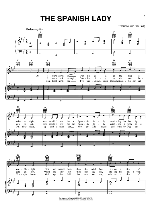 Digital Sheet Music for The Spanish Lady by scored for Piano/Vocal/Chords; id:373101