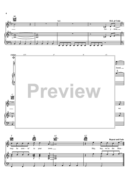 Digital Sheet Music for Theme From "The Monkees" (Hey, Hey We're The Monkees) by The Monkees, Tommy Boyce, Bobby Hart scored for Piano/Vocal/Chords; id:368781