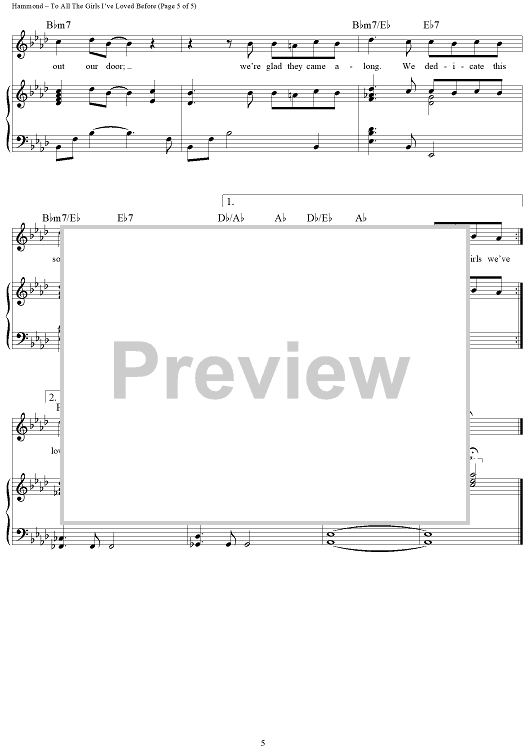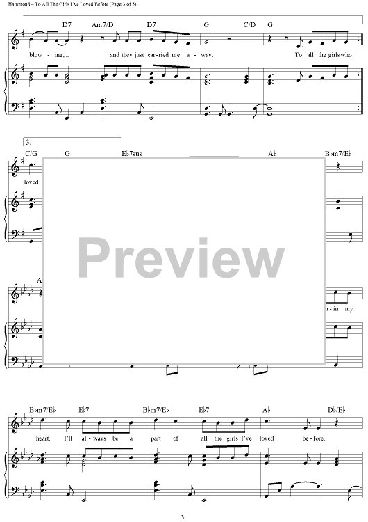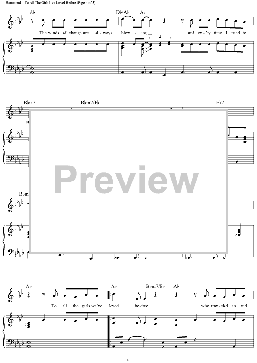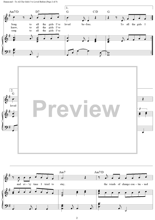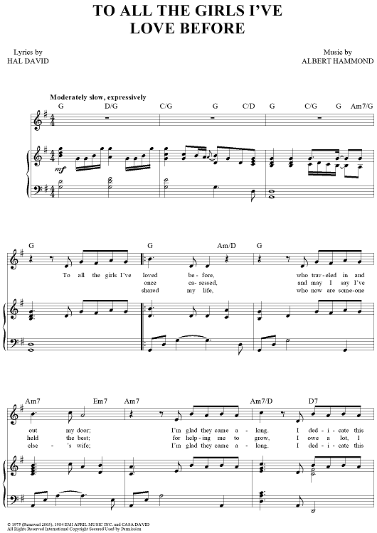 Digital Sheet Music for To All The Girls I've Loved Before by Albert Hammond, Hal David, Willie Nelson scored for Piano/Vocal/Chords; id:374716