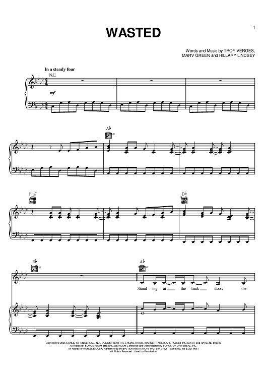 Digital Sheet Music for Wasted by Marv Green, Troy Verges, Hillary Lindsey, Carrie Underwood scored for Piano/Vocal/Chords; id:395843