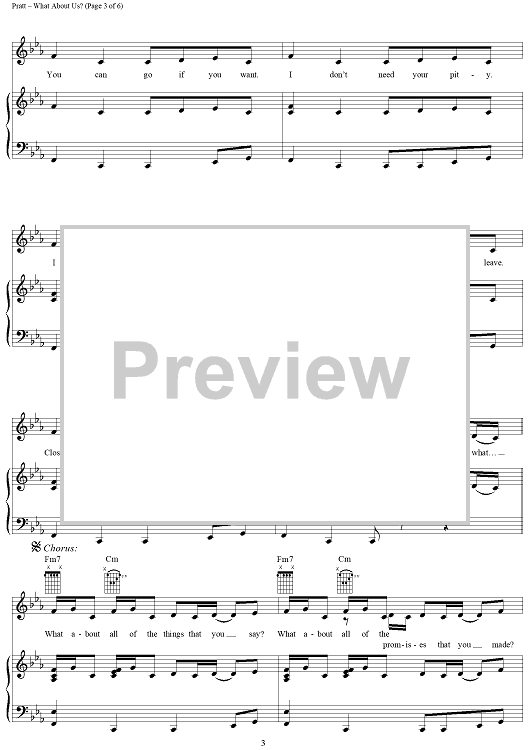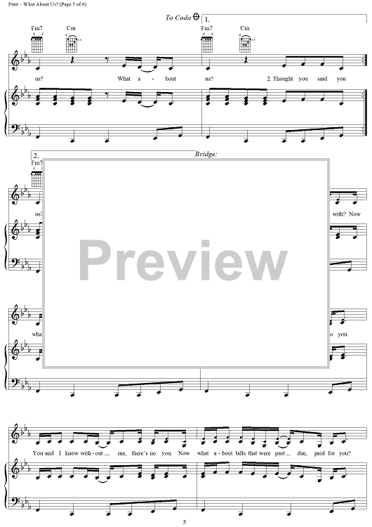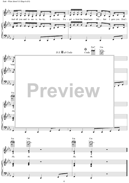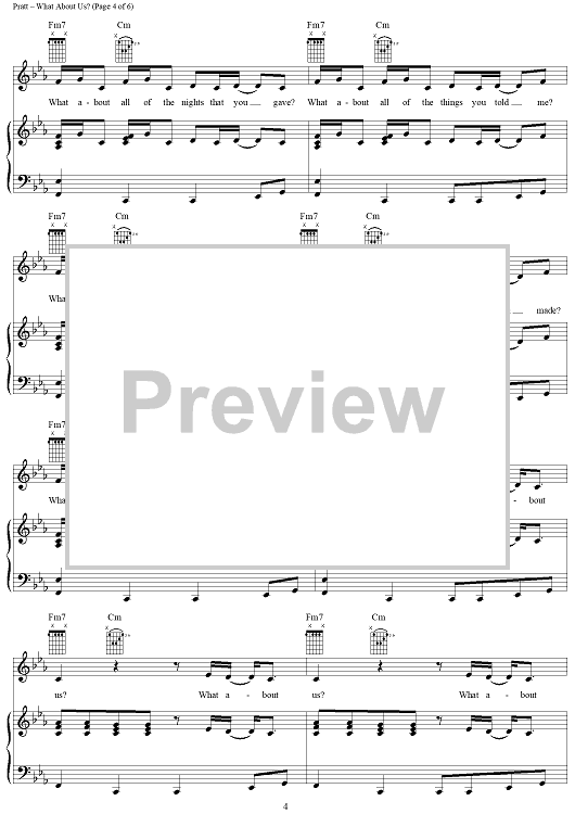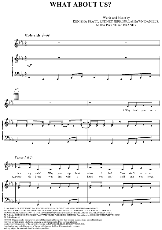 Digital Sheet Music for What About Us? by Rodney Jerkins, LaShawn Daniels, Brandy, Nora Payne, Kenisha Pratt scored for Piano/Vocal/Chords; id:287991