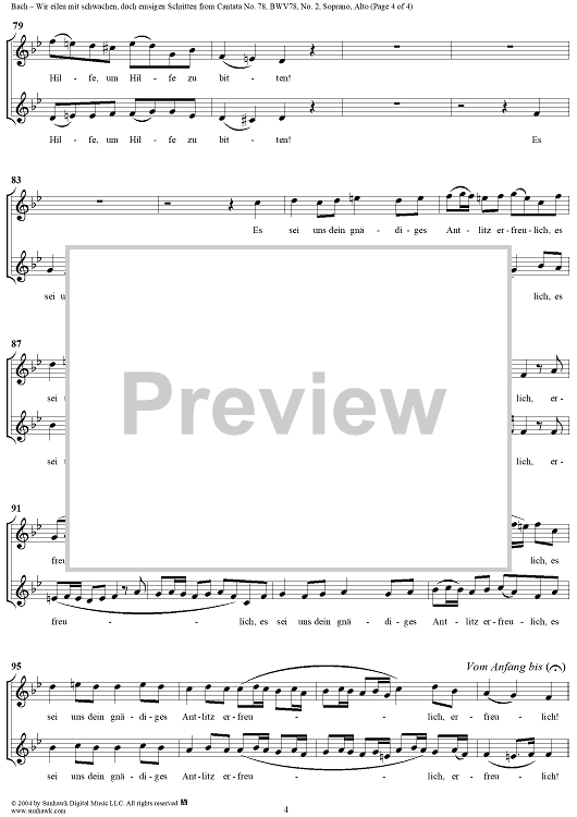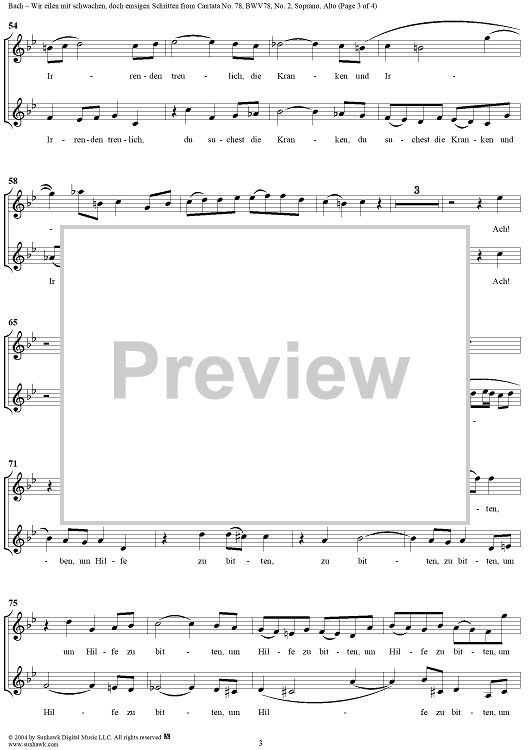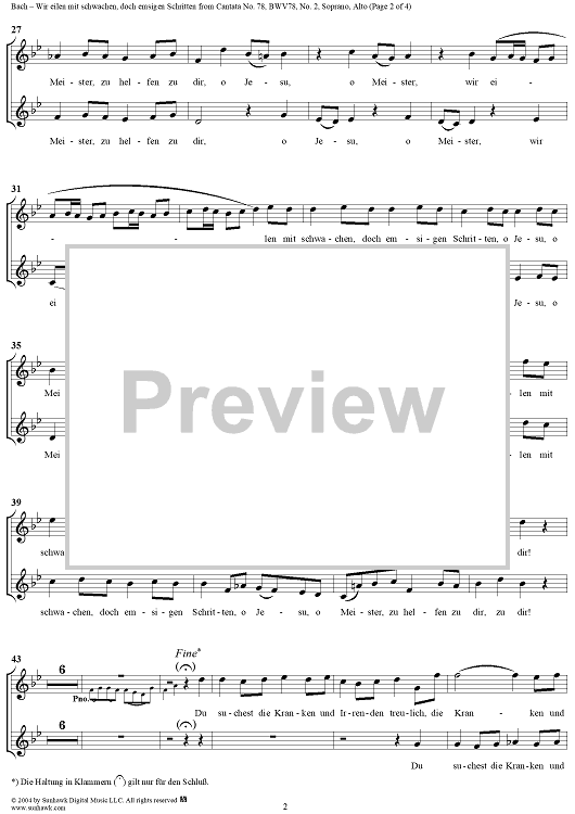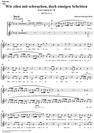 Digital Sheet Music for "Wir eilen mit schwachen, doch emsigen Schritten", Duet, No. 2 from Cantata No. 78: "Jesu, der du meine Seele" - Soprano and Alto by Johann Sebastian Bach scored for Soprano, Alto, Cello and Piano or Organ; id:304076