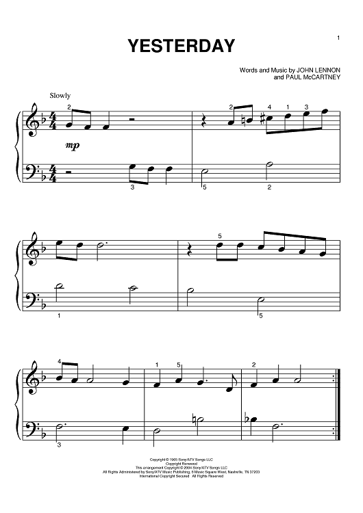 Digital Sheet Music for Yesterday by Paul McCartney, The Beatles, John Lennon, Boyz II Men, En Vogue scored for Big Note Piano; id:373507