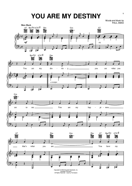 Digital Sheet Music for You Are My Destiny by Paul Anka scored for Piano/Vocal/Chords; id:395416
