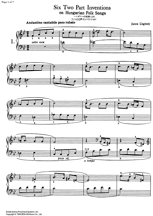 Digital Sheet Music for 6 Two Part Inventions on Hungarian Folk Songs by , Janos Cegledy scored for Piano Solo; id:333257