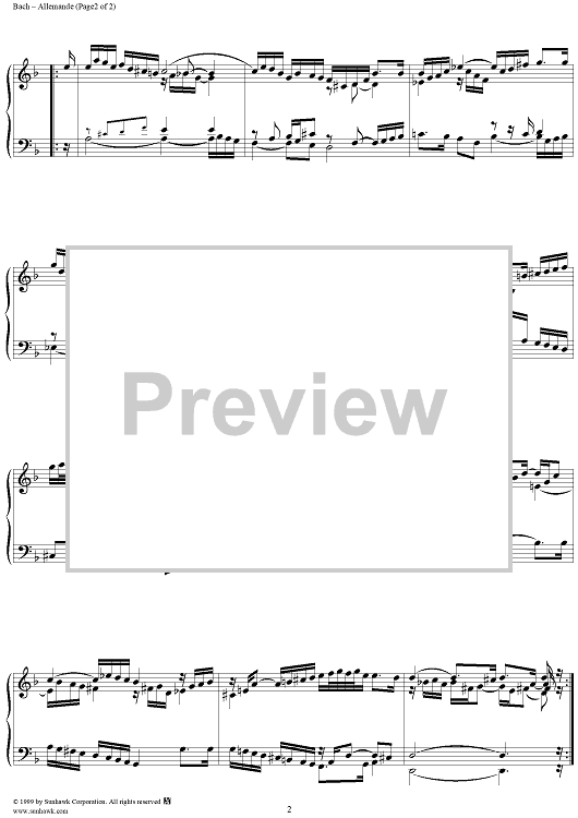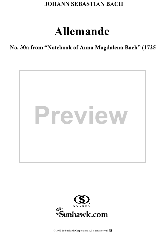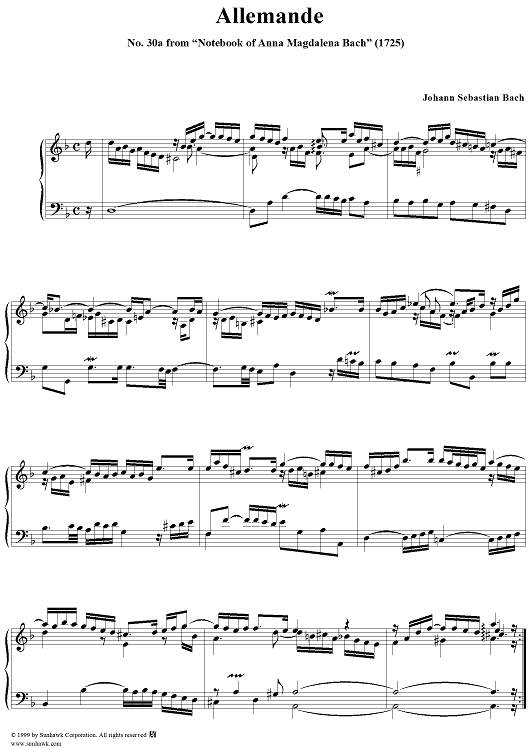 Digital Sheet Music for Allemande - No. 30a from "Notebook of Anna Magdalena Bach" (1725) by Johann Sebastian Bach scored for Piano Solo; id:274233
