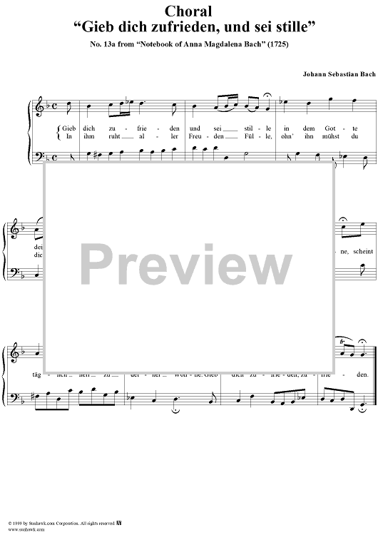 Digital Sheet Music for Choral ("Gieb dich zufrieden") (Second) from the Notebook of Anna Magdelena Bach by Johann Sebastian Bach scored for Piano Solo; id:241122