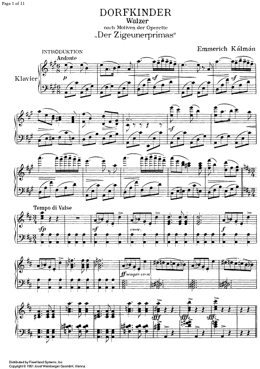 Digital Sheet Music for Dorfkinder. Walzes over motives from Der Ziguenerprimas by , Emmerich Kalman scored for Piano Solo; id:348330