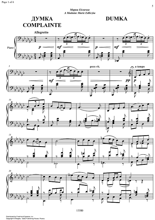 Digital Sheet Music for Dumka by Mily Balakirev scored for Piano Solo; id:337162