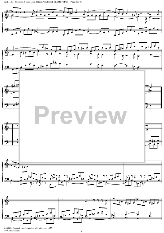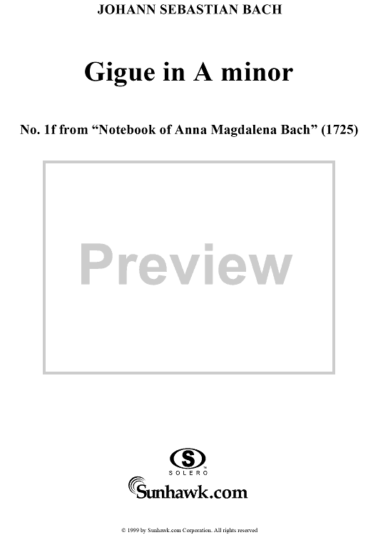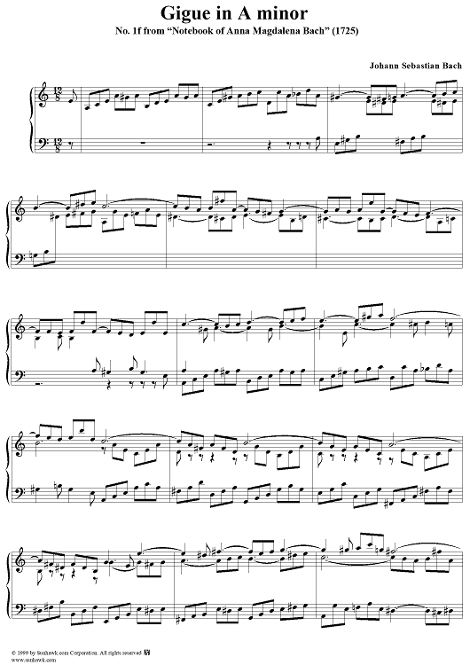 Digital Sheet Music for Gigue in A Minor from the Notebook of Anna Magdelena Bach by Johann Sebastian Bach scored for Piano Solo; id:241111