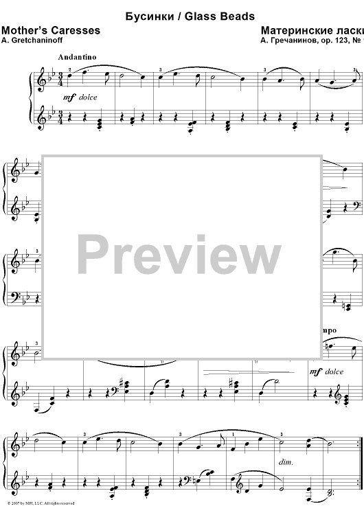Digital Sheet Music for Glass Beads. 11. Mother’s Caresses by Alexander Gretchaninoff scored for Piano Solo; id:364029