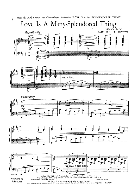 Digital Sheet Music for Love is a Many-Splendored Thing by Sammy Fain, Paul Francis Webster, John Lane scored for Piano Solo; id:433184