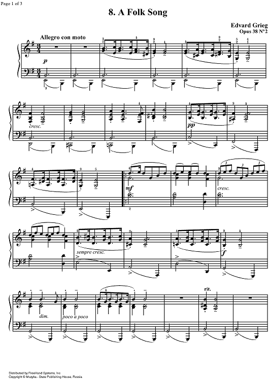 "Lyrical Pieces Op.38 No. 2 - Volksweise (Popular melody)" Sheet Music by Edvard Grieg