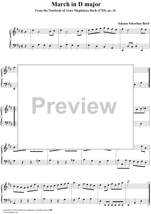 Digital Sheet Music for March in D major from the Notebook of Anna Magdelena Bach by Johann Sebastian Bach scored for Piano Solo; id:110331